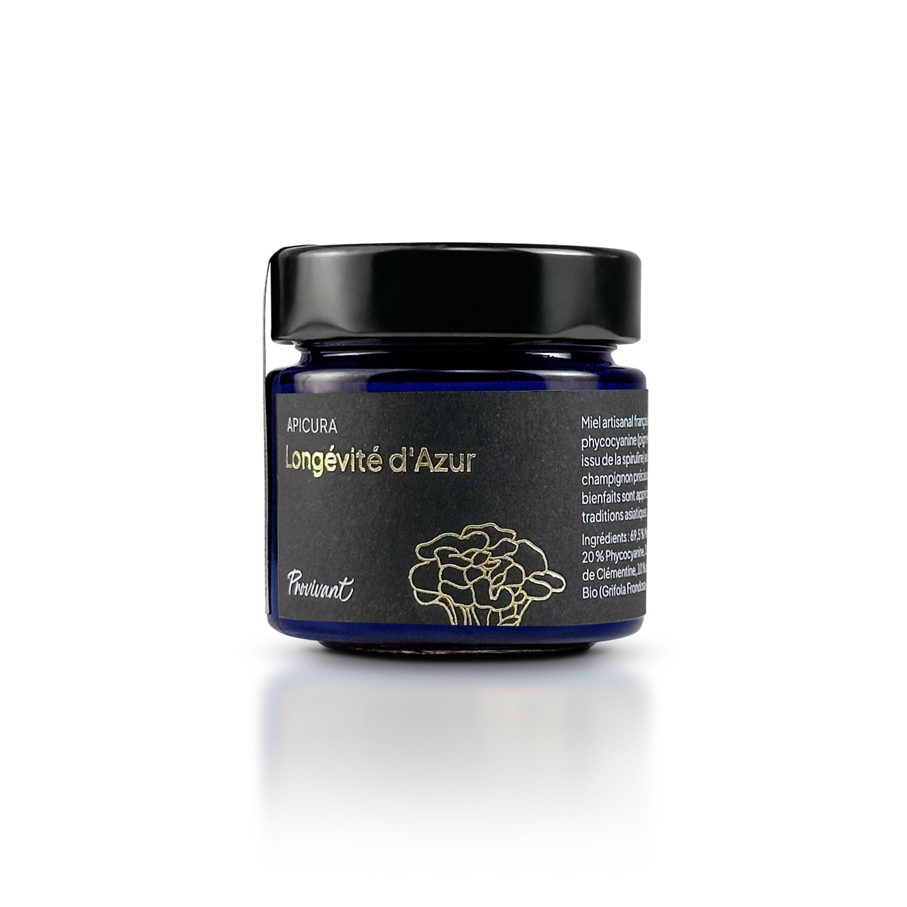 Une formule qui va surprendre quiconque verra ce flacon ! Longévité d’Azur est un complément alimentaire révolutionnaire qui soutient la vitalité et la jeunesse de votre corps. Combinant la phycocyanine issue de la spiruline, un pigment bleu naturel étudié pour ses propriétés anti-inflammatoires et le maïtaké, un champignon fonctionnel (“médicinal”) aux vertus immunitaires.